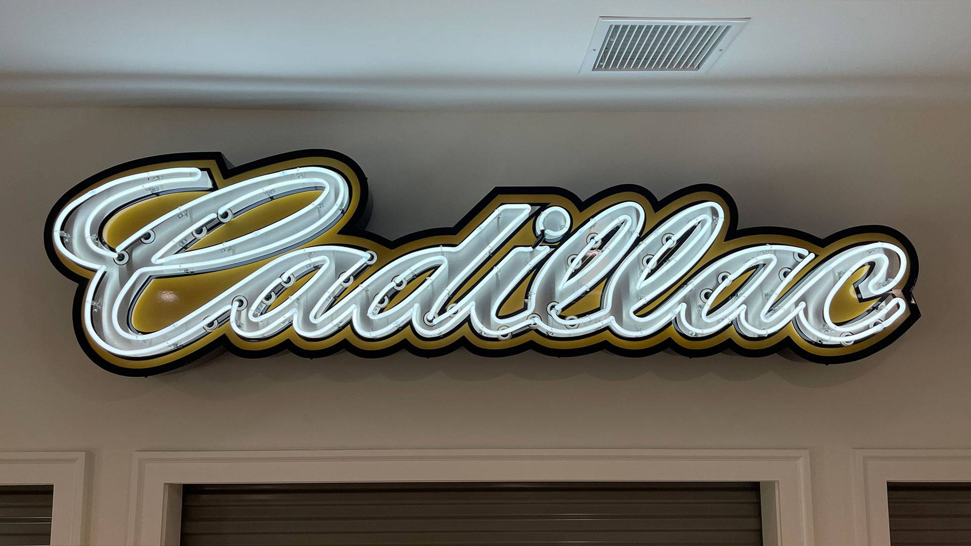Neon road cadillac sign lit on