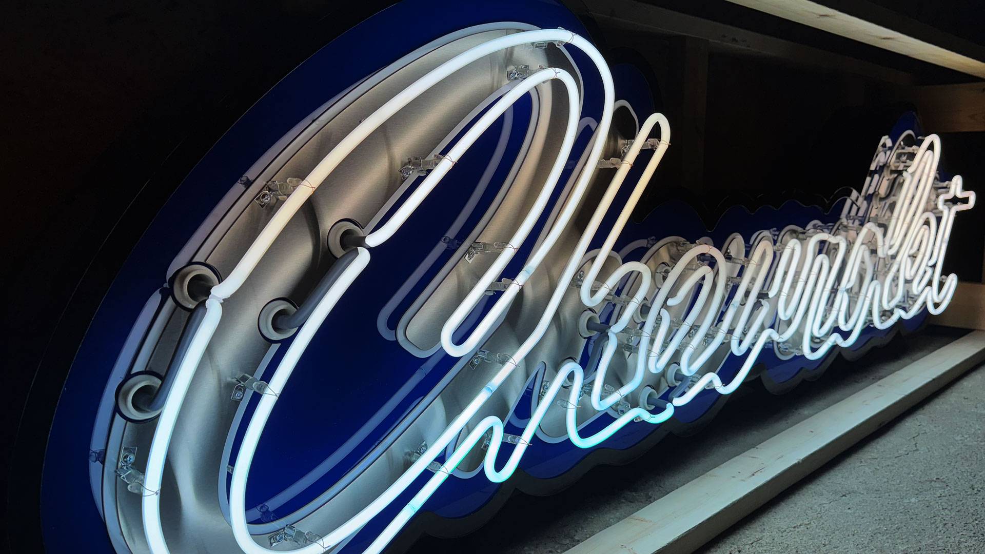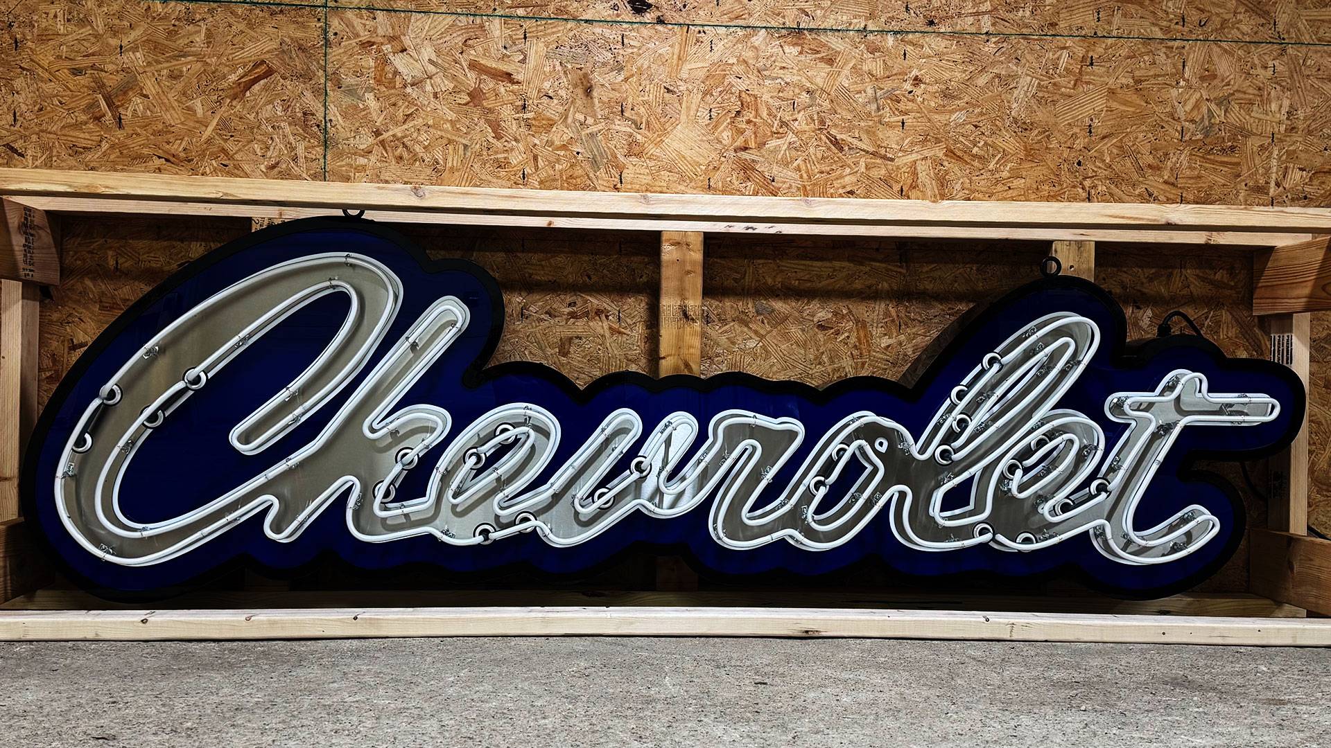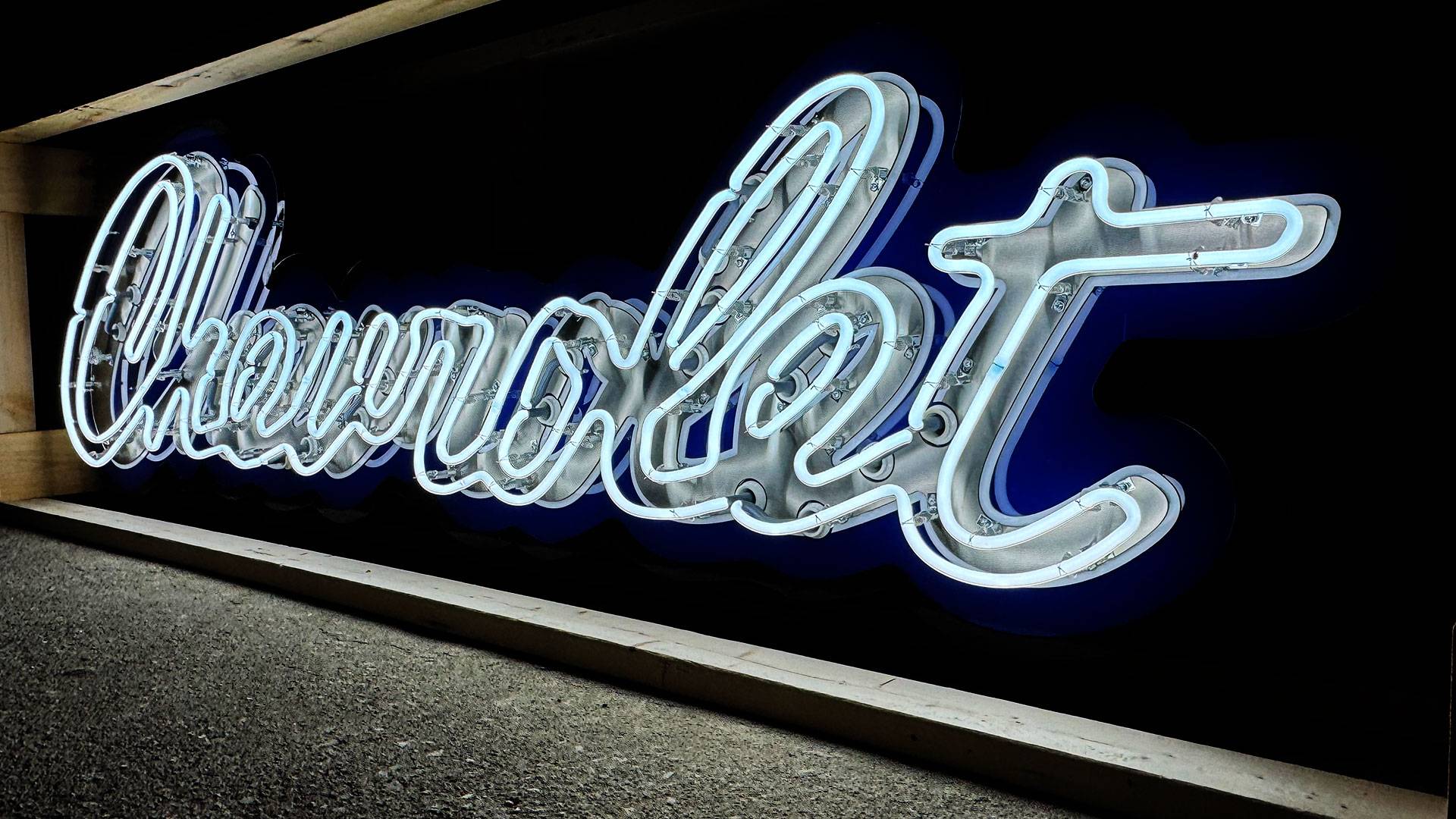 Wide shot of chevrolet script logo neon sign without lights turned on
